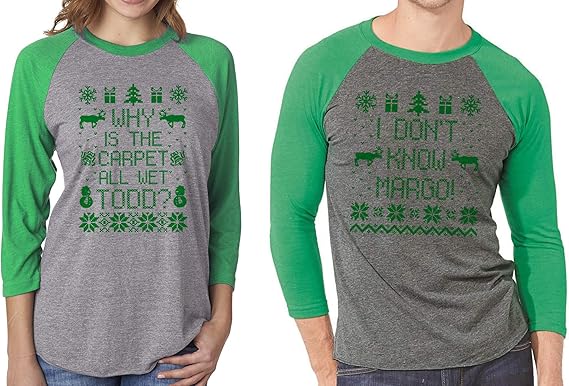 Signaturetshirts Matching Couples Ugly Christmas Sweater Todd And Margo 3 4 Sleeve Raglan Tee Amazon Com